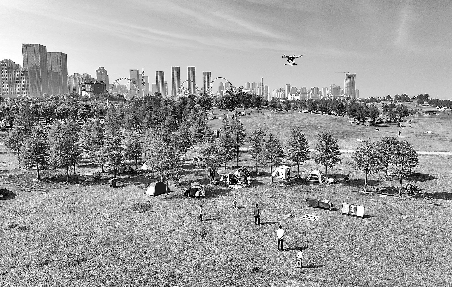 图为无人机在安徽省合肥市岸上草原配送外卖。